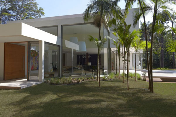 This house really looks modern. It painted all in white and mostly the wall in the front side made from tampered glass. This two floor house has an outdoor pool in the front yard. The pool is quite big enough. The front yard also covered with the green grass and some green tall trees. And the floor surrounded the pool made from laminate flooring. However, the other parts of the yard covered with white floor from the entrance door to the veranda.The veranda near the pool is classy. It is equipped with a set of wooden table and chair. The table is square and big enough. The poles and the roof borders are painted in white. The inside roof is covered with nice pergola. This room also fitted a white fan. The chandeliers are hanging on the roof right upside the table. This room also has cabinets and white chairs. The backside of this room covered with tempered glass, while the others side has no walls.